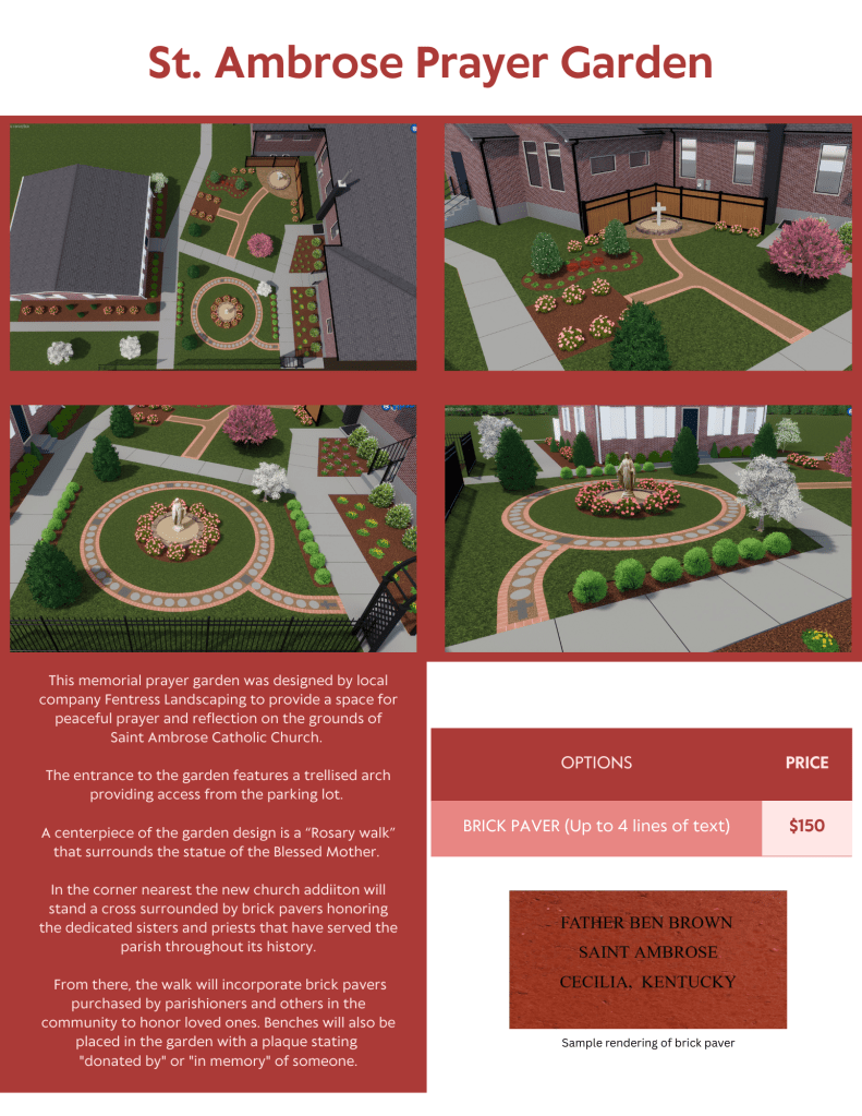 We are excited to be adding an outdoor prayer space to the grounds of the church. It will be located between the church and the rectory. The project is anticipated to begin later spring 2025 with completion by the rededication of the church in July 2025.